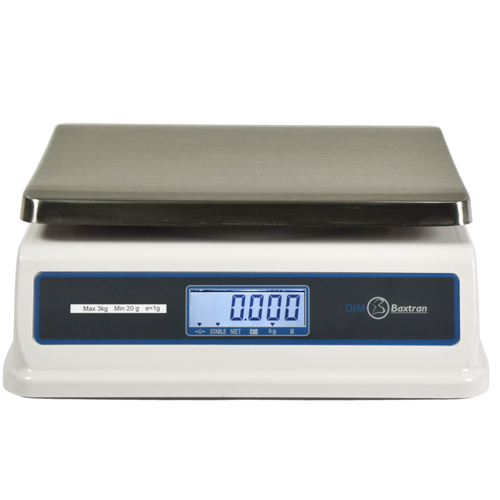 Respuesta: La balanza DIM está disponible en capacidades de 3 kg (división de 1g), 6 kg (división de 2g), 15 kg (división de 5g) y 30 kg (división de 10g).