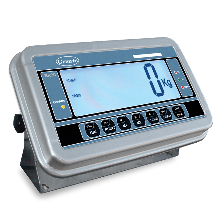El indicador BR30 es versátil y puede mostrar el peso en varias unidades de medida seleccionables: kilogramos (kg), gramos (g), libras (lb) y onzas (oz).