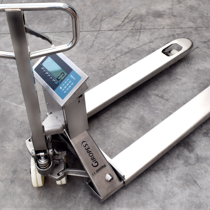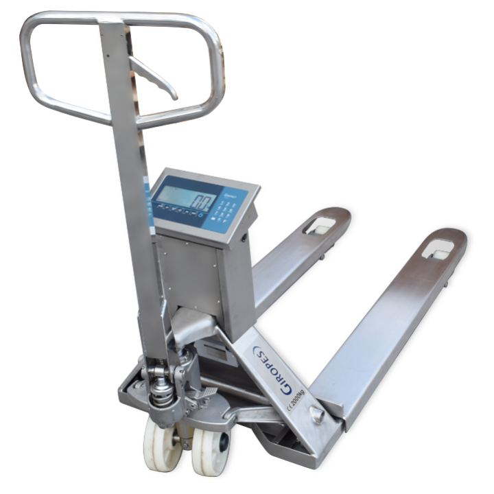 Este equipo cuenta con una capacidad máxima de 2500 kg y una resolución de 1 kg. Las horquillas tienen una medida de 680 x 1220 mm, siendo ideales para palés americanos. Incorpora un indicador BR90 con pantalla LCD retroiluminada de 6 dígitos de 24 mm y cuatro células de carga de alta precisión. La estructura es de chapa de acero robusta y las ruedas son de nylon para un movimiento suave. Dispone de una batería interna recargable de 6V/4Ah, con adaptador AC/DC, ofreciendo una autonomía de aproximadamente 80 horas. Sus funciones incluyen Cero, Tara, Acumulación, Cuenta piezas, Función límite, Función Hold, Función Peso Neto/Bruto y Autoapagado.